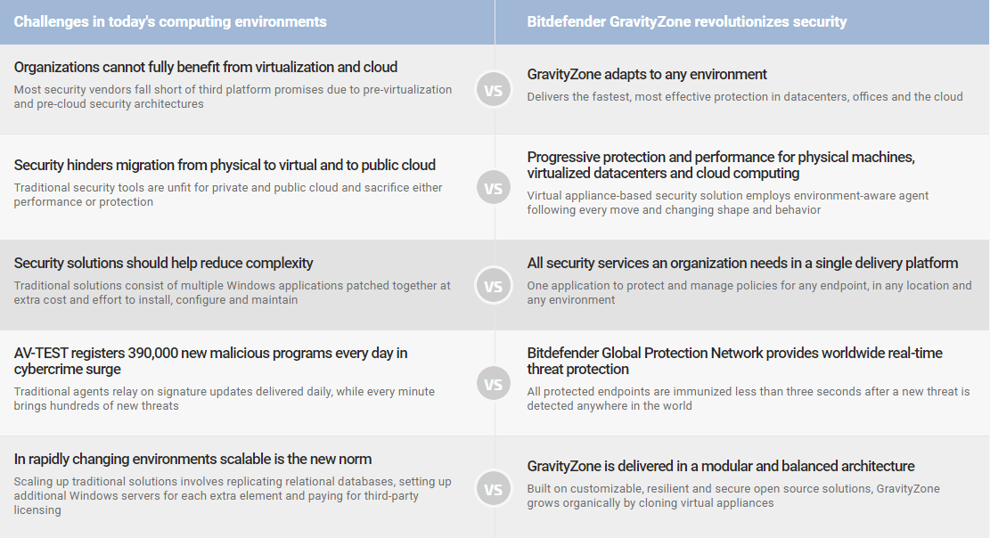 Unlike traditional solutions that patch together pre-virtualization and pre-cloud Windows applications, BitDefender GravityZone combines all the security services an organization needs into a single delivery platform to reduce your cost of building a trusted environment for all endpoints.